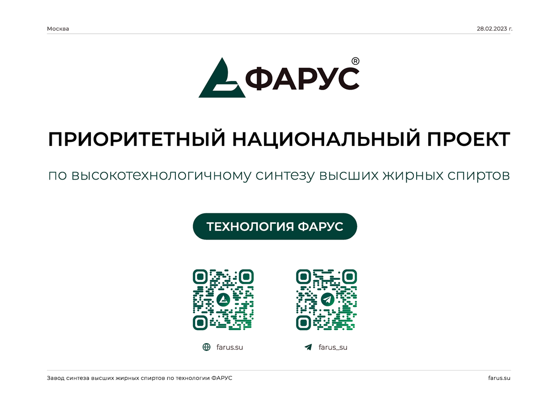 Будущий завод по производству синтетических высших жирных спиртов по технологии ФАРУС играет решающую роль в полной локализации производства критической основы, необходимой для обеспечения 100% потребностей российского рынка в производстве бытовой химии, текстиля, нефтепродуктов, строительных материалов и других сферах промышленности
